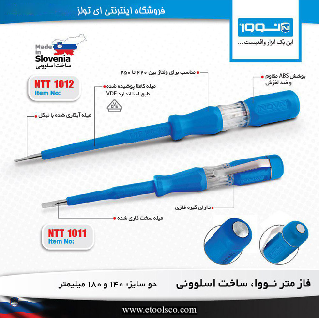 فازمتر نــووا مدل NTT 1012: گروه نووا ماموریت خود را اینگونه قرار داده است تا ابزارهایی عرضه کند که با هر چالشی مقابله کنند. شما مکانیک هستید یا ساختمان ساز و یا نجار و برق کار، .... و یا تنها یک طرفدار ابزار، هر شغلی که دارید مطمئن باشید که در همه این موارد نـــووا مناسبترین ابزار برای شماست، نــووا ابزارهایی دارد که برای هرکاری قابل استفاده هستند.