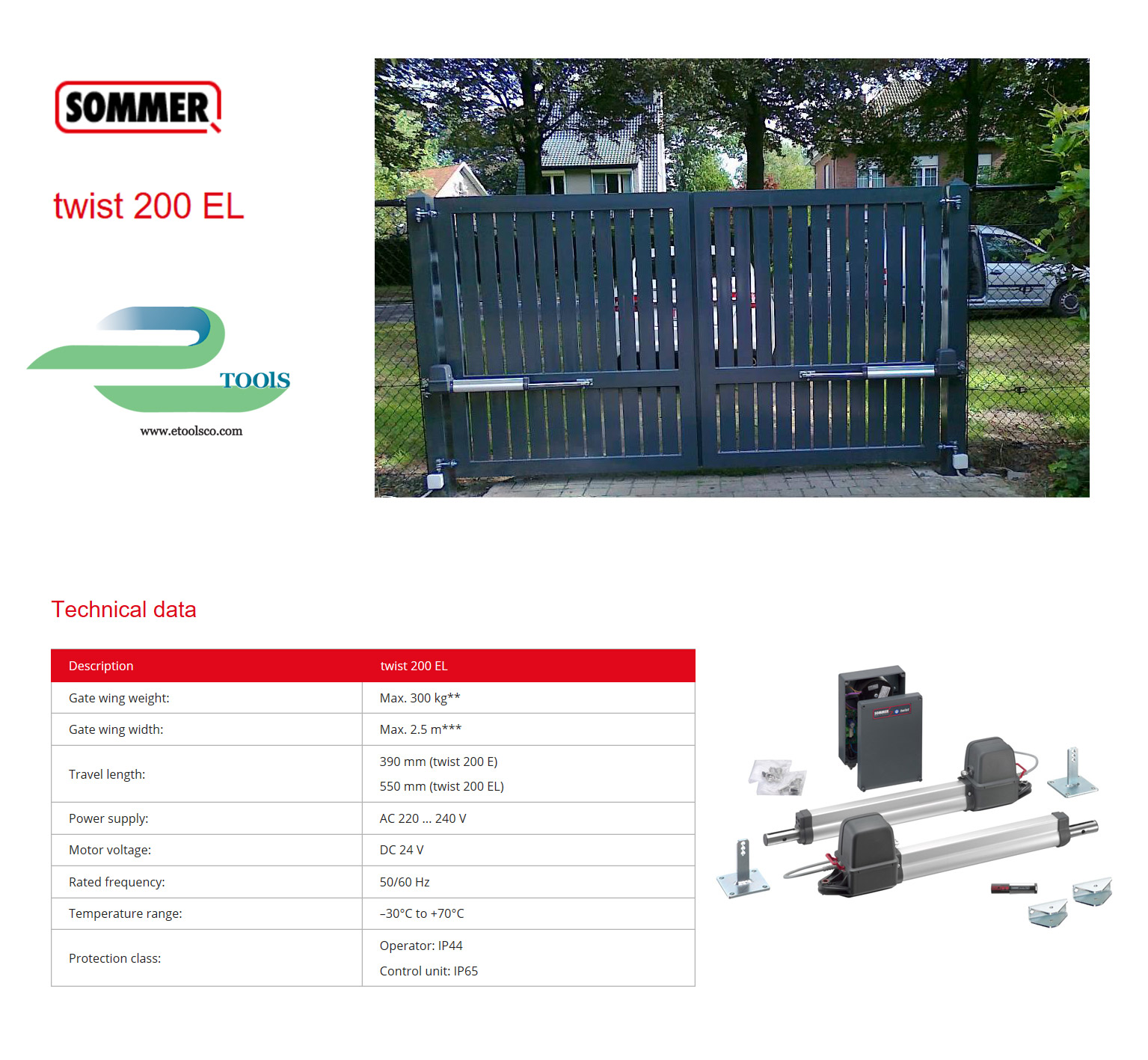 * twist 200 EL دارای کورس بلندتر از مدل E و مخصوص درب های تا هر لنگه به وزن 250 کیلوگرم و عرض هر لنگه حدود 160 سانتیمتر می باشد.