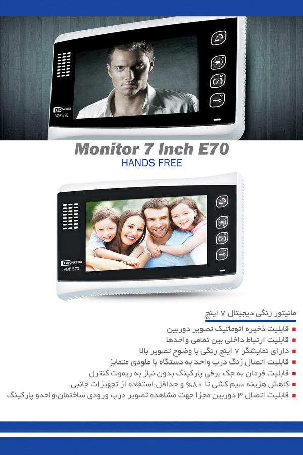 | قابلیت اتصال به یک دوربین دیگر | قابلیت اتصال به دو دوربین مجزا جهت مشاهده پارکینگ و جلوی درب ورودی واحد و قابلیت اتصال به کلید زنگ درب واحد |